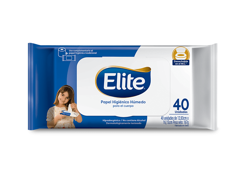 Papel higiénico Elite Húmedo, es ideal para uso complementario al papel higiénico tradicional. Es desechable en el inodoro, máximo 2 hojas por descarga. Elite Húmedo tiene extracto de algodón, es hipoalergénico y no contiene alcohol.