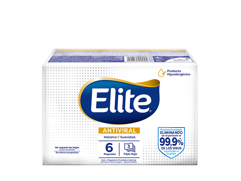 Elite Antiviral, pañuelo hipoalergénico de triple hoja para un máximo cuidado de tu piel. Previene el contagio, eliminando en el pañuelo el 99,9% de los virus asociados a la gripe.